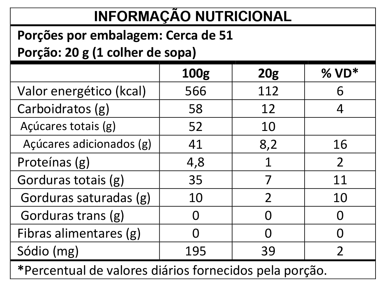 Açúcar, gordura vegetal, soro de leite em pó, gotas de biscoito sabor chocolate (farinha de trigo enriquecida com ferro e ácido fólico, açúcar, gordura vegetal, cacau em pó, sal, corante caramelo III, emulsificante lecitina de soja, fermentos químicos bicarbonato de sódio e bicarbonato de amônio e aromatizante), leite em pó, sal, emulsificante lecitina de soja, aromatizantes e antioxidante butil hidroquinona terciária.